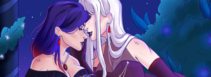 Especially so, because Emilia had made it crystal clear that she was not done with her just yet — by way of tightening her grip on Elise’s hip with one hand while the other sought the heat between her legs anew.Elise felt the other’s fingers re-enter her yet again, soothing the fire within her and stoking the flames all at once. She could have easily moved away, being on top of Emilia, and yet she lingered despite her own words. She knew Emilia took note of this too, because her eyes lit up like amber held to the sun — a sight that made Elise’s breath hitch in the back of her throat.Just as her lips parted to say something however, Emilia hushed her softly. “You have been such a good girl, why stop now? Let me take care of you, one more time. Come here,” she said, giving Elise’s hip a downward tug. Elise didn’t need to be told twice, lowering herself onto her partner until their bodies lay flush together.Both hands brushed up along Emilia’s chest, shoulders and neck, until they found the soft skin of her cheeks. She caressed Emilia’s face as their eyes remained locked and Emilia’s fingers curled, drawing a breathy moan from the dancer.Elise dipped down and found Emilia’s lips with her own, then. The kiss was softer than the others they had shared that night, as if to drive home the point that, yes, Elise did want Emilia to take care of her one last time. She wanted to be left more than just satisfied, because she never knew when they would see each other again or if they even would.A thought surfaced; Emilia could easily find another lover during her trips. Someone more stable, who didn’t have to leave her for work like Elise did. Maybe even someone who could travel with her. Elise deepened the kiss they still held, her tongue pressing at lips, teeth, and tongue as well, a moan swallowed from the back of her throat.Her hands tangled with indigo hair now, fingers intertwining with locks before giving them a light tug. She didn’t have to tell Emilia to reciprocate — she already was, from the way she matched Elise’s fervent kissing to the way her hand angled itself to better allow fingers to slip in and out of her, all the while the soft base of her thumb gave some much needed attention to her clit.Elise only drew away from her lover’s lips to catch her breath, then buried her face in Emilia’s neck, kissing that instead. She nipped briefly at the skin, then bit down hard enough to bruise, yet not enough so to draw blood.Emilia panted against the pressure of Elise’s mouth. The hand of hers that had been keeping Elise in place against herself by her hip, it moved upwards to stroke down the dancer’s back, leaving red lines in the wake of her nails by her spine. She didn’t ask Elise what the sudden change in mood had been about, and in a way Elise was relieved that she didn’t.She just wasn’t ready to let Emilia know just how much she missed her when she was gone, nor how much she loved their time spent together. Loved her, even, as she had recently come to realize.Emilia’s fingers curled again and Elise’s brows knitted together. Her exhaustion almost entirely forgotten about at this point, Elise’s hips rolled in smooth motions over Emilia’s own — the movements only momentarily broken up by slight jerks when Emilia’s fingers began to settle into a faster rhythm.Another bite sank into Emilia’s neck, the other side this time. “Harder,” Elise’s voice had a slight tremor to it. When Emilia met her request and then some, Elise’s nails dug into her shoulders and her teeth released her neck all the while hips grinded downwards in a near desperate manner.And before she knew it, she was already climaxing, causing Elise’s entire body to shake and tense up. Moans filled the air, hungry, greedy, though some softer breaths were kissed into Emilia’s neck and earlobe in between them.Emilia only slowed to a stop when Elise’s muscles began to relax, releasing the iron hold she had on her. Emilia sank into the mattress, then, allowing Elise a few moments to catch her breath while arms enveloped her softly. The bliss of the moment was everything Elise could have wanted, right then — her head rested gently atop her partner’s chest, listening to the heavy thumping within and wondering why it never really slowed down.No words were needed, as it often went. Simply existing for a while in each other’s company was more than enough.A single kiss pressed to the inside of a breast, Elise’s eyes fluttering closed. She didn’t even register how Emilia turned them both over on their sides, eventually, cradling the dancer’s head against her collar as they both drifted off.Her secret remained safe another night, despite the way her heartbeat only slowed into a normal rhythm once she found sleep.